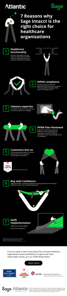 Healthcare finance teams are flooded with data. The ones that can wrangle that data and use it to supercharge their operations are the ones that grow. See below for the 7 main reasons why Sage Intacct is ideal for Healthcare organizations looking to scale.